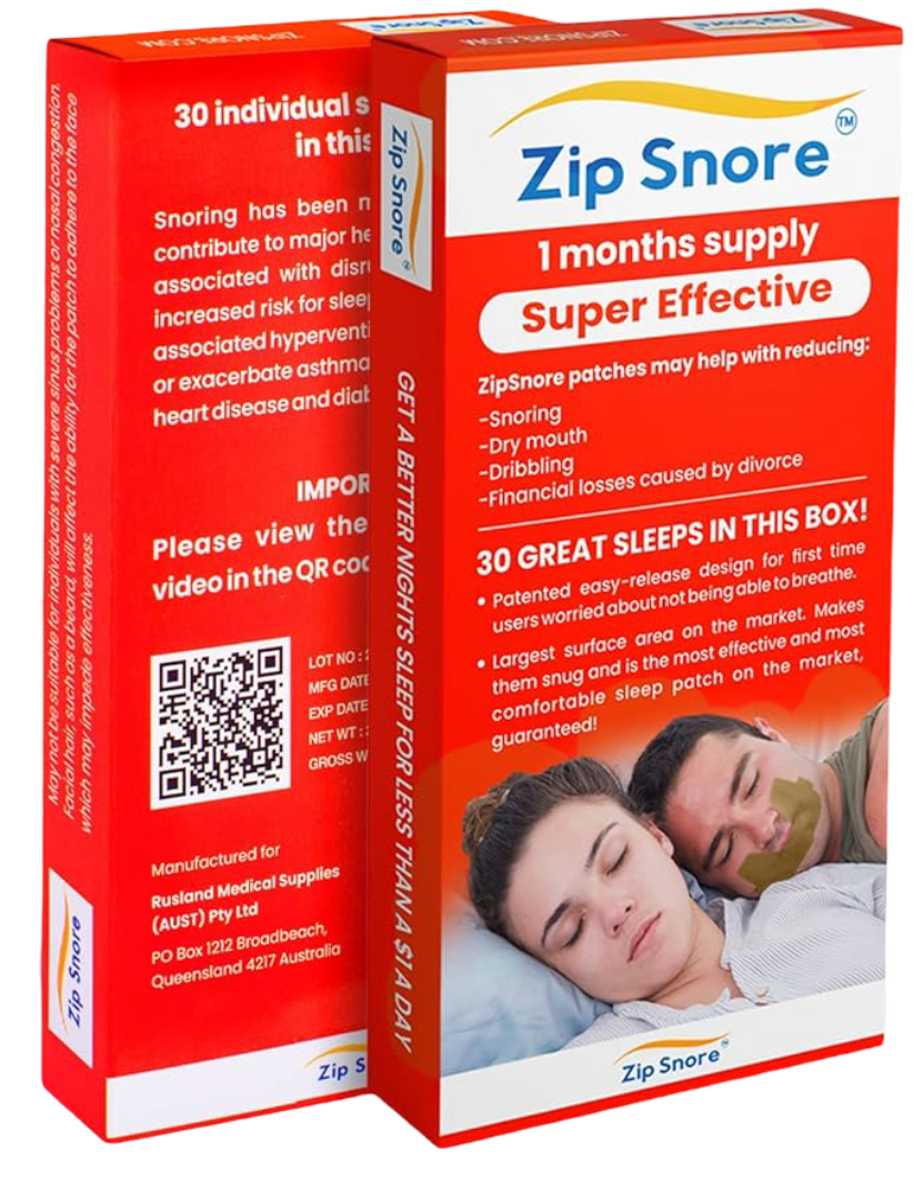 The second test using my Zip Snore patch showed that no snoring was noted. And no periodic leg movements were noted. This clinically proves that my zip snore patch gave me a better night’s sleep with no noise. I have patented the Zip Snore anti-snore patch and it is TGA and FDA approved as a Class I medical device designed to assist in the reduction of snoring. The snore patch is comfortable and easy to use, it is also PBA, PVC, and latex-free. I have been using the snore patch for 18 months and it is a life-changer for me.
